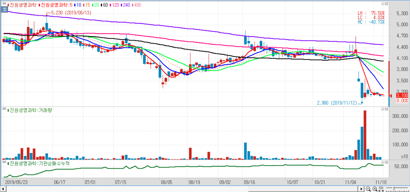 지난 20일 진원생명과학의 주가는 전일보다 1.4% 하락한 3100원에 거래를 마쳤다. 이틀째 내리며 52주 신저가 부근으로 추락했고, 이달 들어서만 24.4% 급락했다.